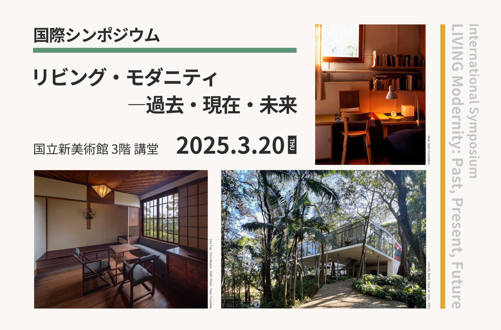 This exhibition brings together a rare and exceptional collection of works spanning the globe,including the United States, Europe, Brazil, and Japan. The exhibition features original, rarelyexhibited drawings by the architects such as Mies van der Rohe and Alvar Aalto in addition toarchitectural drawings, models and photographs of both exteriors and interiors. Furnitureand household items designed for their residential projects, along with films, will also be ondisplay. The exhibition offers a comprehensive reexamination of re through these diverseworks and images.