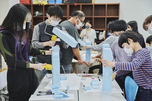 1日目は、まず作りたいワニの姿を考えて画用紙に描いた後、直方体のスタイロフォームに下書きをして、ヒートカッターでワニの輪郭を切り出しました。続いてカッターで面取りして、紙やすりで削り、胴体の形を整えます。さらに、針金と紙粘土を使って前足と後ろ足を作り、初日の作業は終了です。2日目は、ワニに4本の足と目玉を取り付けて全身の形が出来上がったら、塗装に取り掛かります。ワニの全身を同じ色で塗るというのが、今回のワークショップのルール。参加者は10色の塗料の中から1色を選び、丁寧に色を塗ってワニを仕上げました。参加者が制作した個性豊かなワニは、ニスを塗布されたのち、「ワニがまわる タムラサトル」展の会場内に展示されました。タムラさん制作のワニたちとともにくるくると回り、展覧会を彩りました。