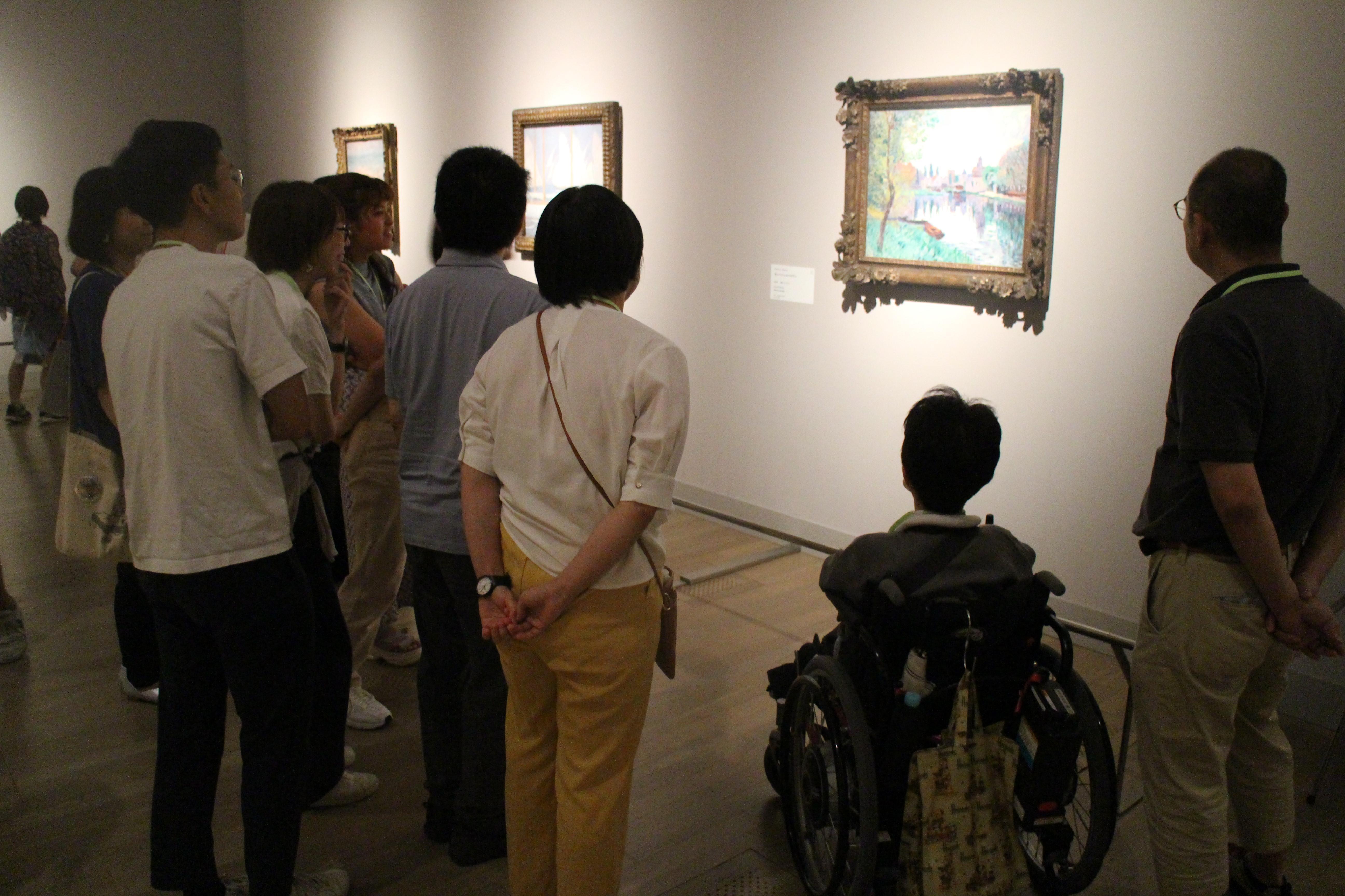 「テート美術館展 光 ― ターナー、印象派から現代へ」の関連プログラムとして「視覚障害者とつくる美術鑑賞ワークショップ」を開催しました。参加者は6~8人程度のグループにわかれて、視覚に障害があるナビゲーターとともに、「光」をテーマに集められた時代も形式も異なる作品の中から、3点に集中して鑑賞しました。作品から「見えること」、そこから得る印象や感じ方などの「見えないこと」、浮かんでくる疑問など「わからないこと」をそれぞれが言葉にしていき、光の表現の時代による変化や作家ごとの違いについて、気付きを共有しました。鑑賞を通じて各々が持つ「光」についての解釈が展開され、作家が作品に込めたメッセージについて想像する機会となりました。