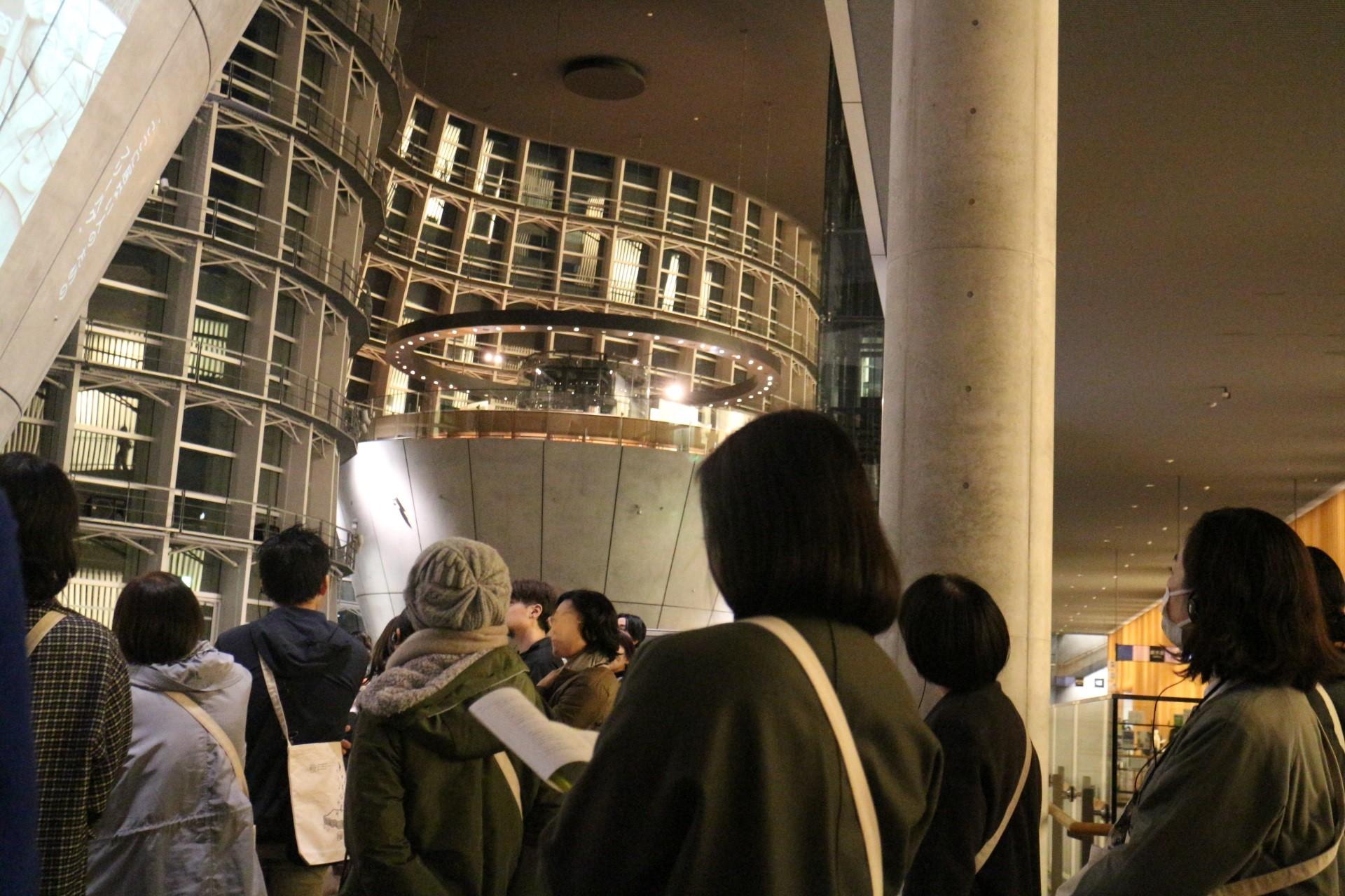 11月最後の週末、木々が葉を落として冬の到来が感じられる美術館で、建築ツアーが開催されました。実施されたのは、黒川紀章氏とともに国立新美術館を設計した株式会社日本設計の社員有志が解説を担当する「マスターコース」と、ライトアップされた夜の美術館を巡る「ナイトコース」、建築の特徴や美術館の活動といった「国立新美術館のイロハ」を学べる入門編の「スタンダードコース」のツアーです。2017年の10月以来、約6年ぶりの開催となったナイトコースでは、ガイド役の美術館スタッフが照明の工夫や夜のビュースポットを紹介し、参加者は光壁に照らし出されて幻想的な容姿となったナイトミュージアムの散策を楽しみました。計4回開催されたツアーには一般公募の91人が参加し、国立新美術館の建築の新たな魅力に触れる2日間となりました。