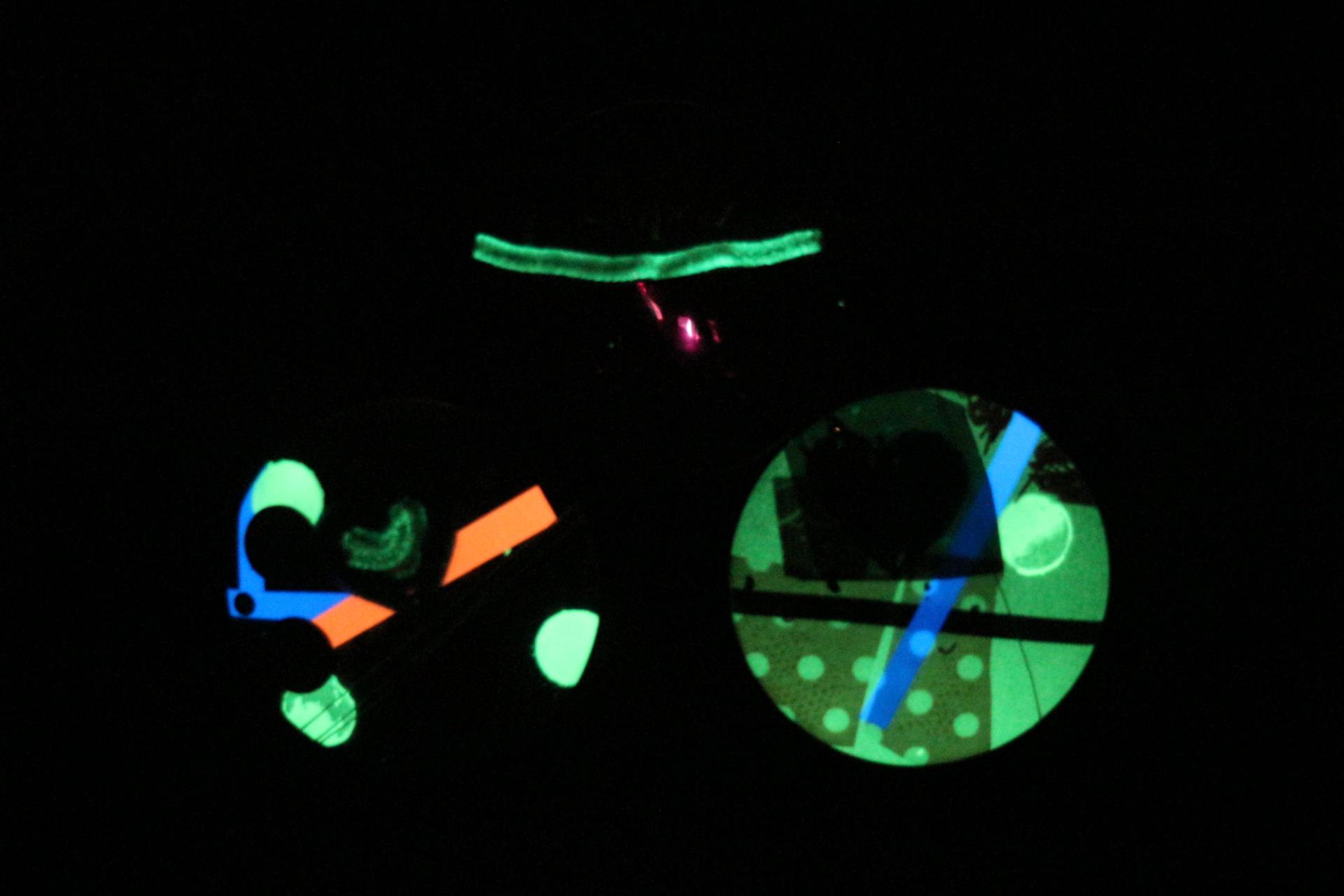 会場には、材料として、色紙やテープ、シール、ペンなどの他、「ホタル」というテーマになぞらえて、蓄光の紙やモールなども並べられました。缶バッジの台紙に、素材を思い思いにコラージュしたり、絵や文字をかいたりして、自分だけの絵柄作りを楽しみます。絵柄が出来たら、マシンでプレスして缶バッジの完成です。プレスマシンのとなりの机には、このワークショップの企画を担当した国立新美術館教育普及室のインターンによる、手作りの暗室ボックスが用意されました。完成した缶バッジをボックスに入れ、中を覗き込むと、明るい部屋で見るのとは違う、暗闇に光るホタルのような缶バッジの姿が。