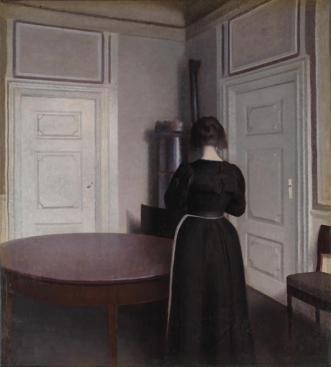 Mother and Child by British painter Sir William Rothenstein (1872–1945) depicts the casual daily life of a parent and her child, using soft light to convey the intimacy between them. In contrast, Interior by Danish painter Vilhelm Hammershøi (1864–1916) uses darker colours and pale light to effectively show the tranquility of the room and coolness of the air.
