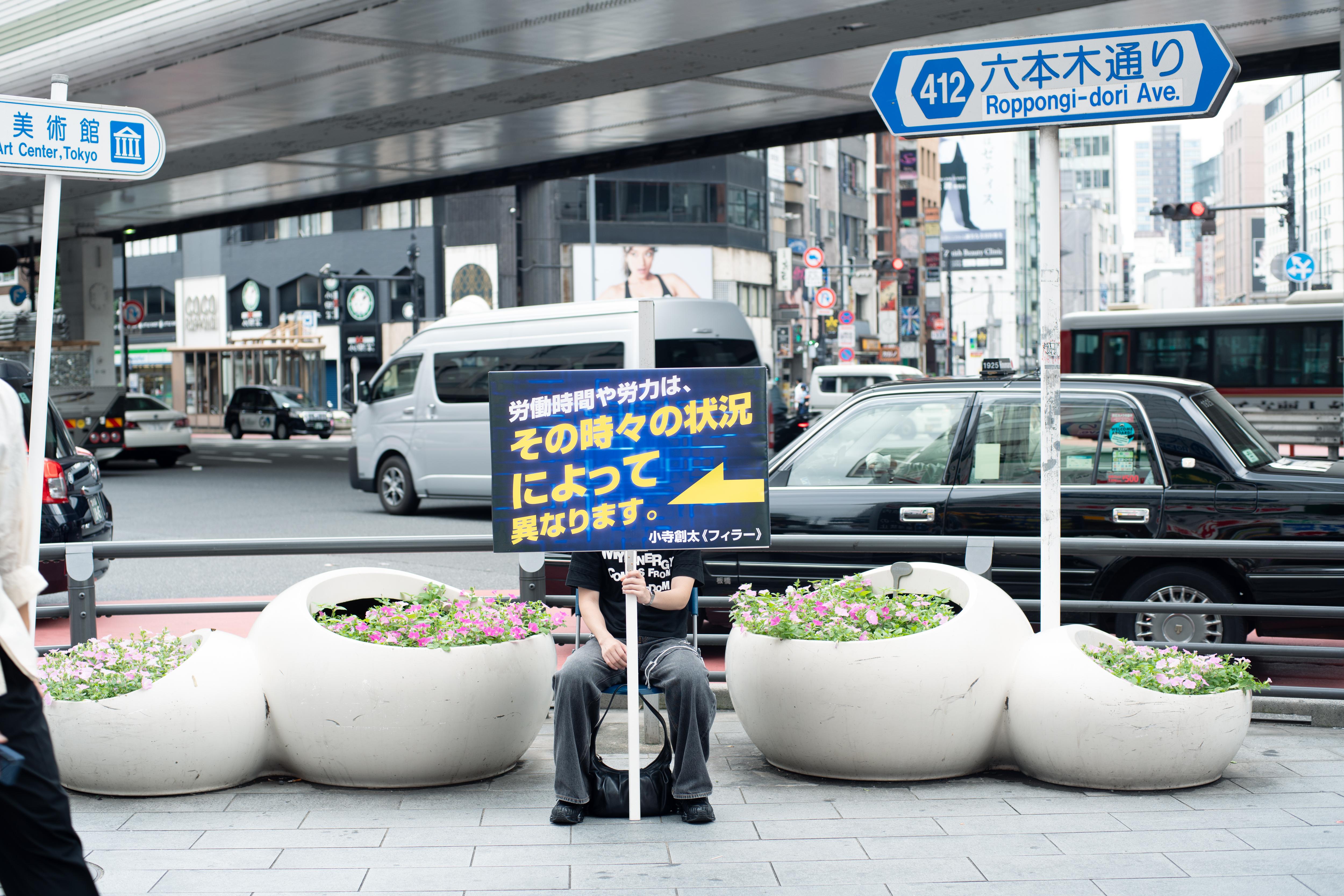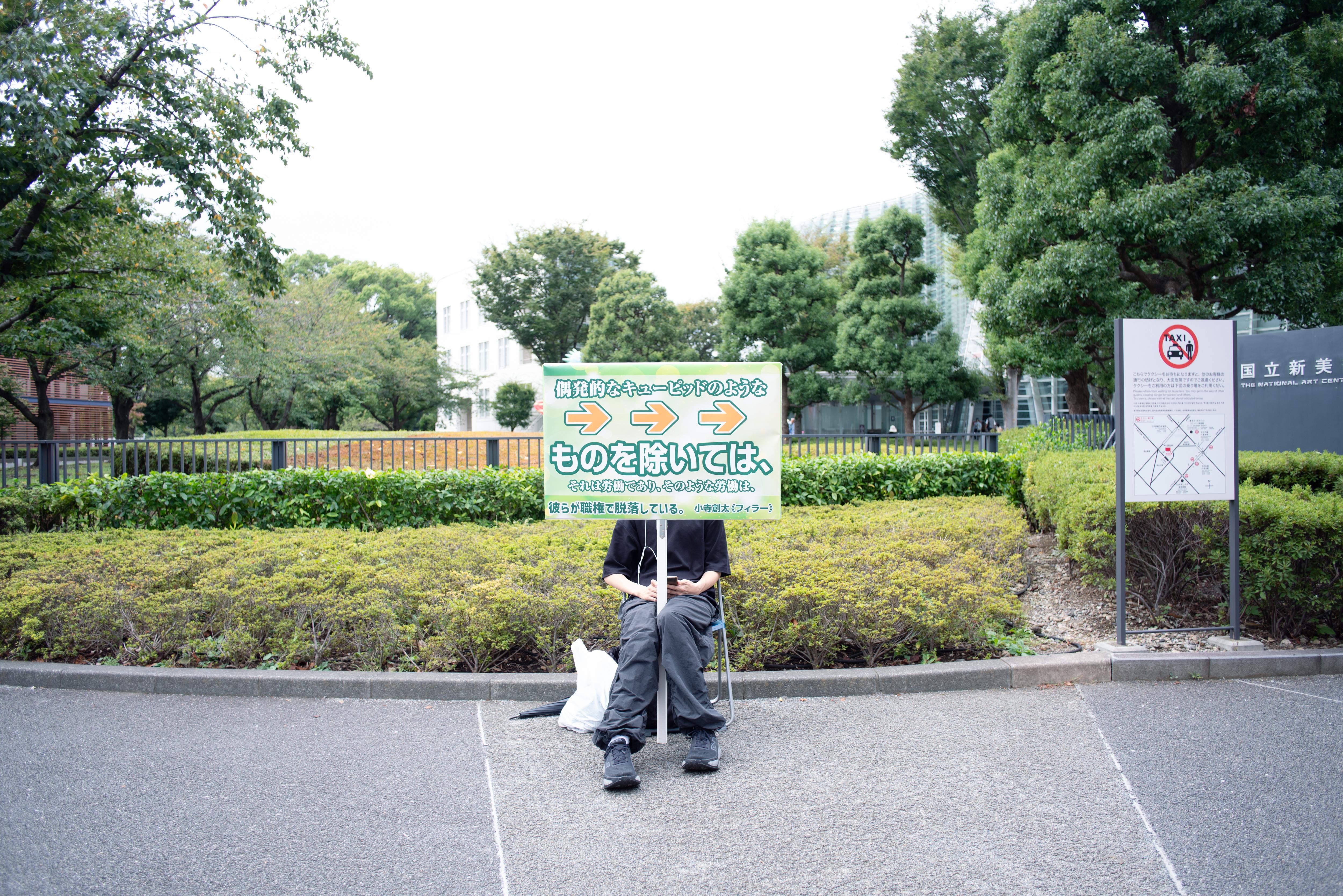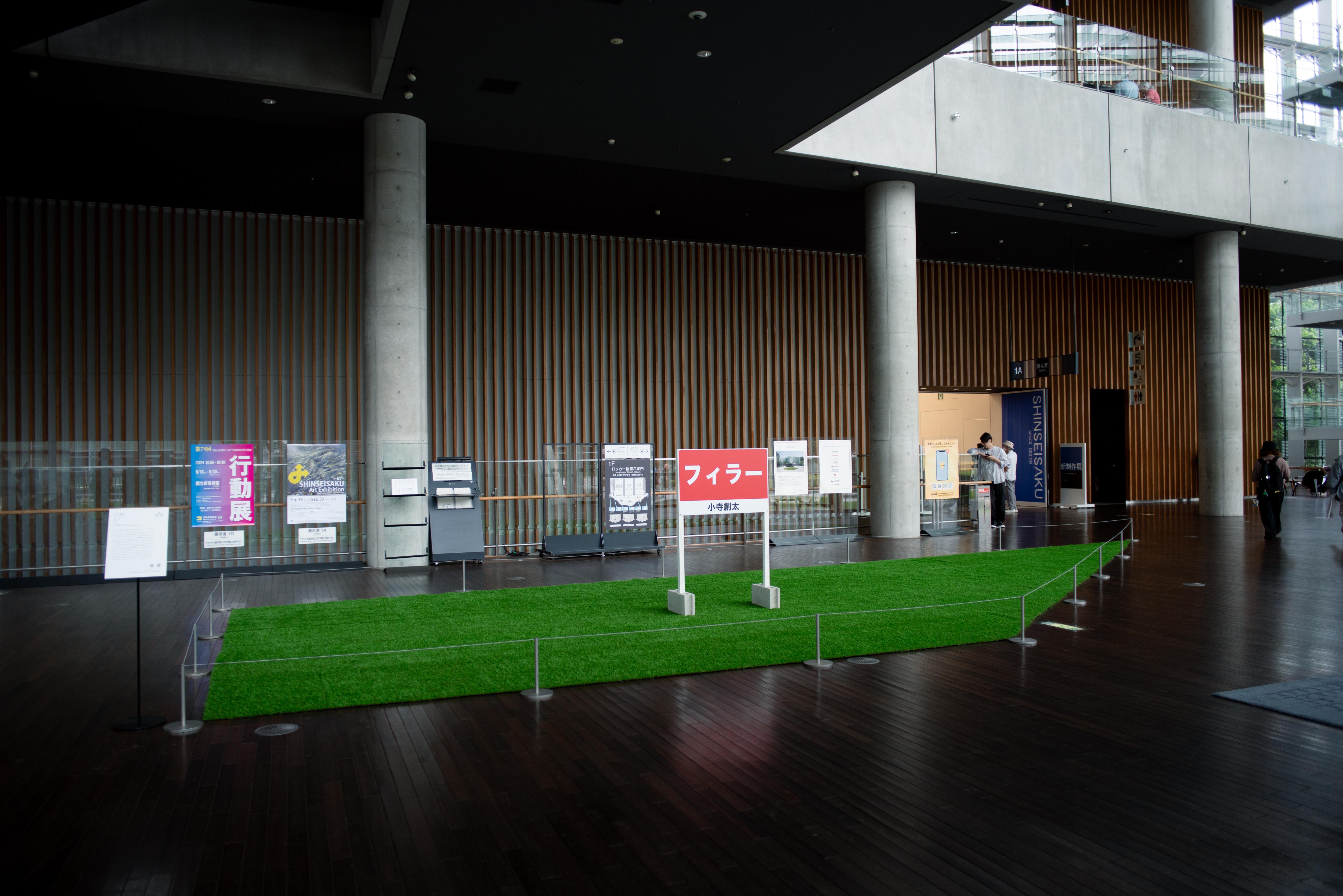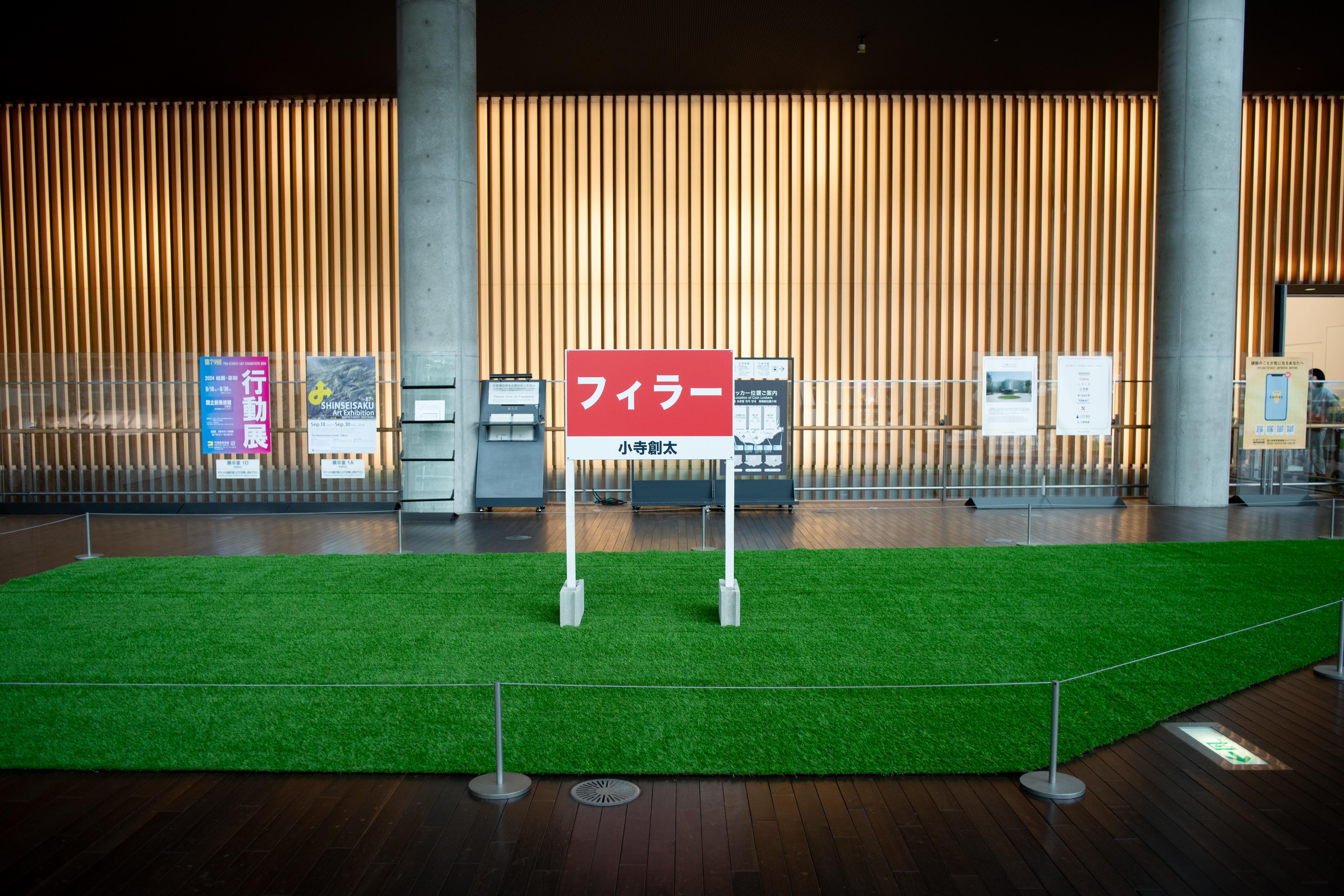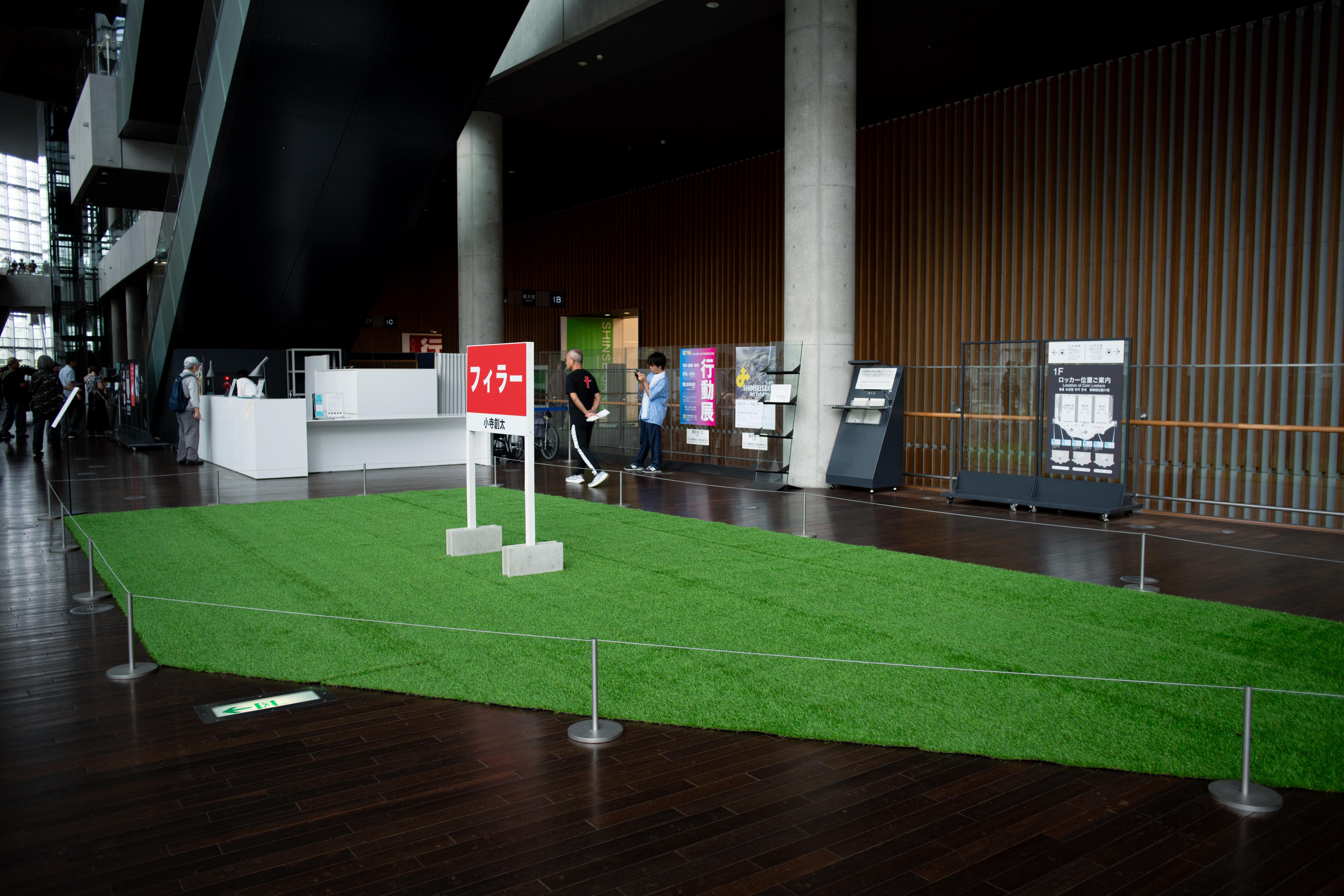 小寺創太は〈いる派〉を名乗り、自らの身体を長時間にわたり展示するパフォーマンス/インスタレーションを制作してきた。しかし本作《フィラー》には、彼自身の身体は作品に含まれず、パフォーマンスは六本木駅から国立新美術館にいたる路上に配置された6人の看板持ちに委任されている。加えて、人工芝ともうひとつの看板が美術館ロビーに設置されている。