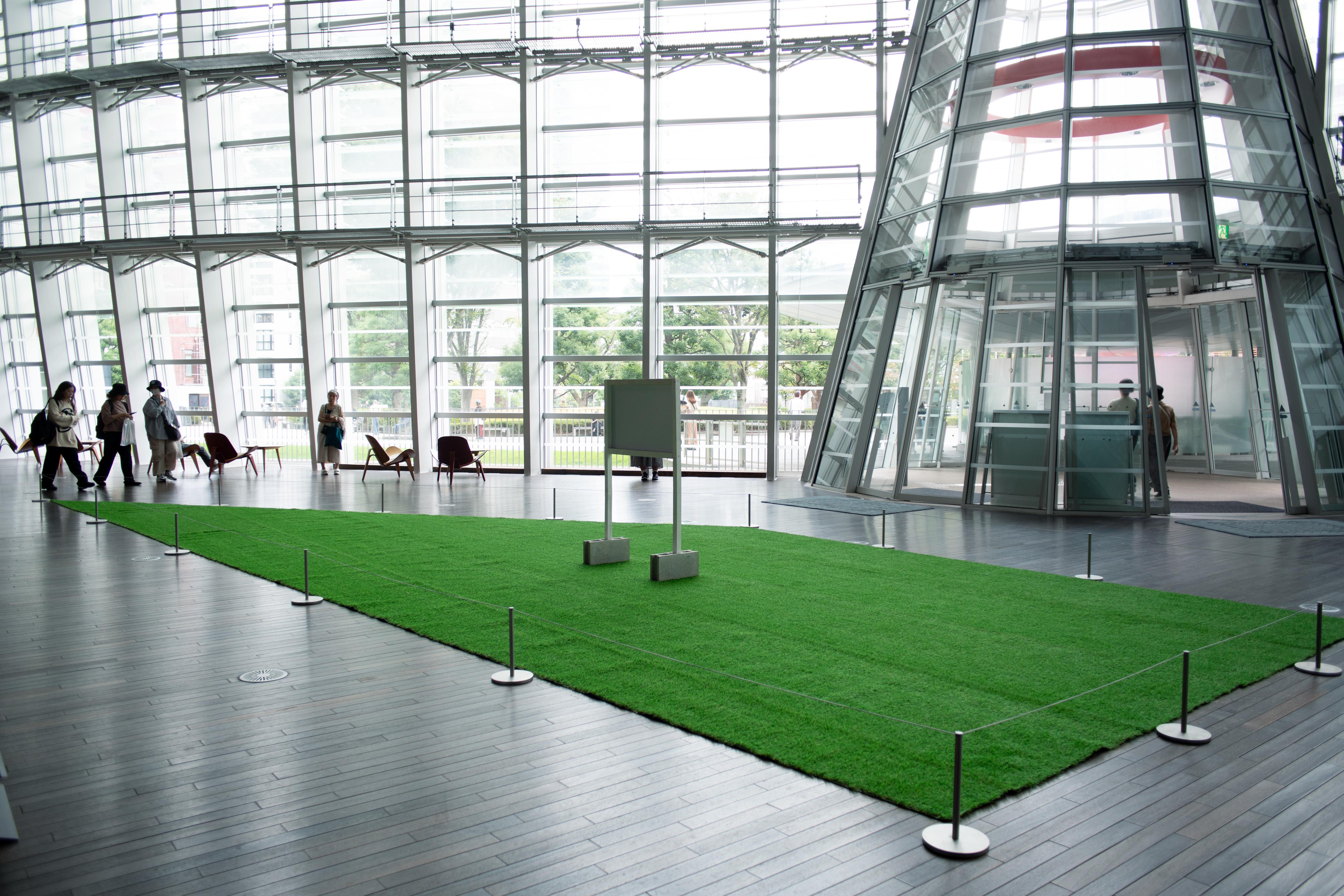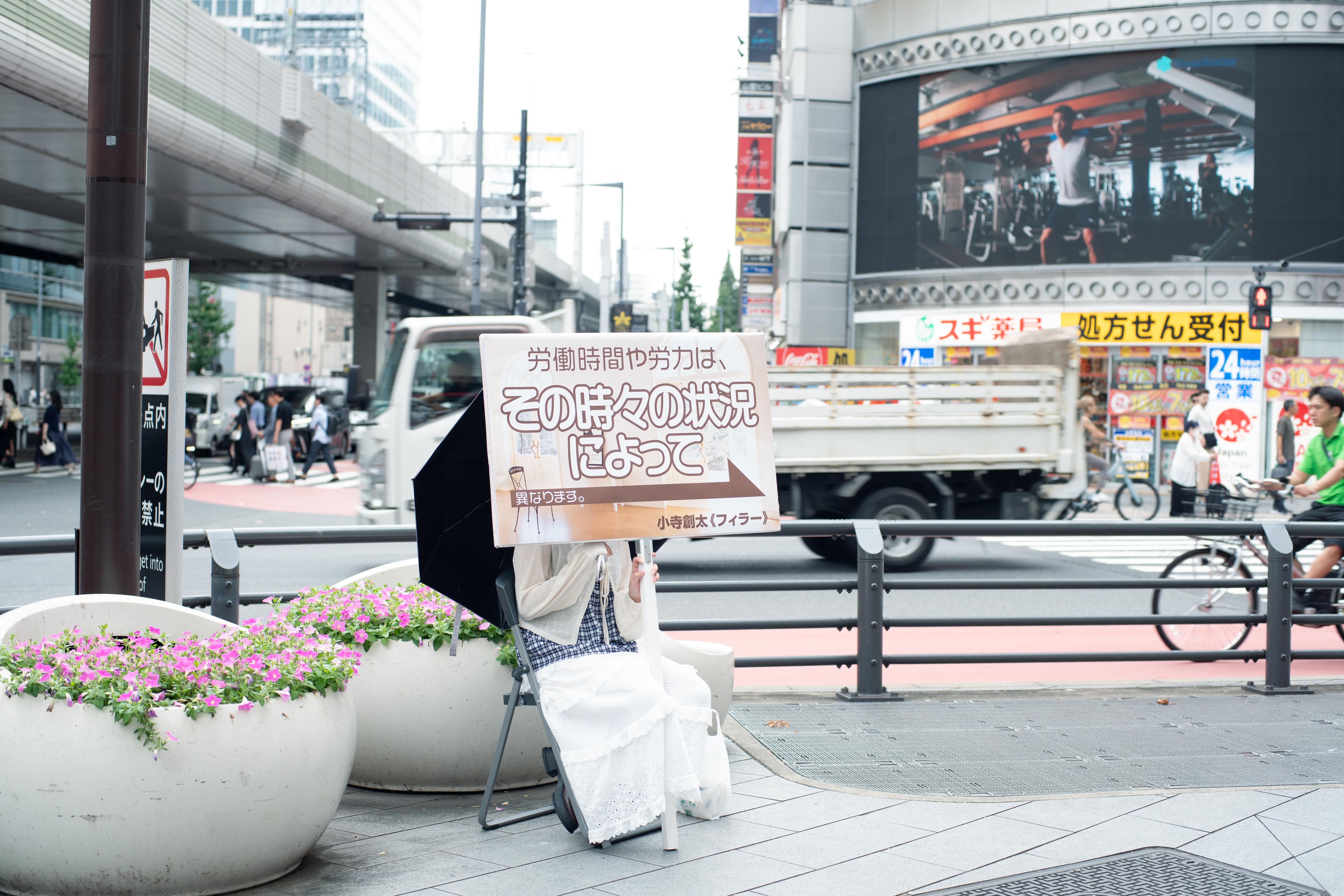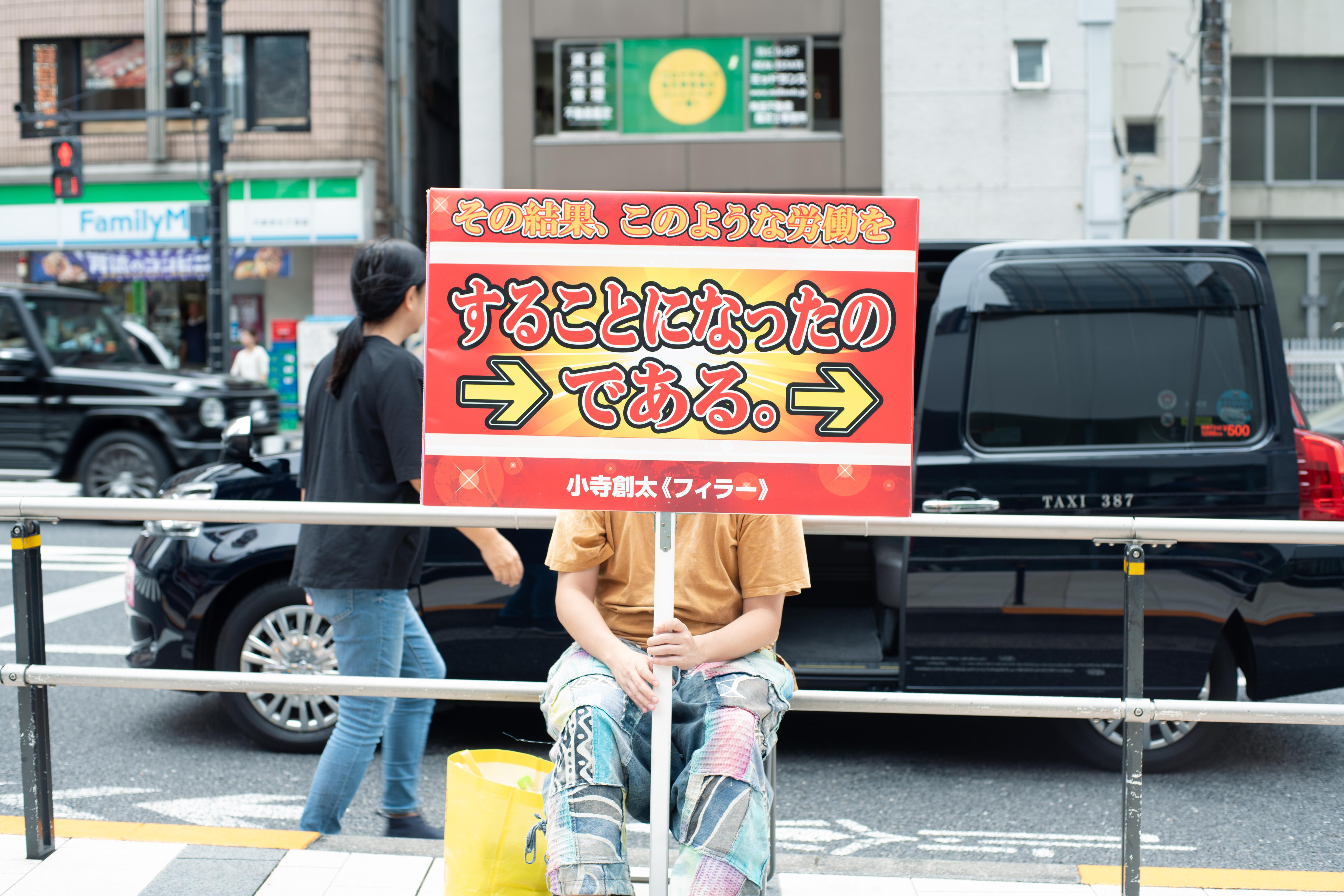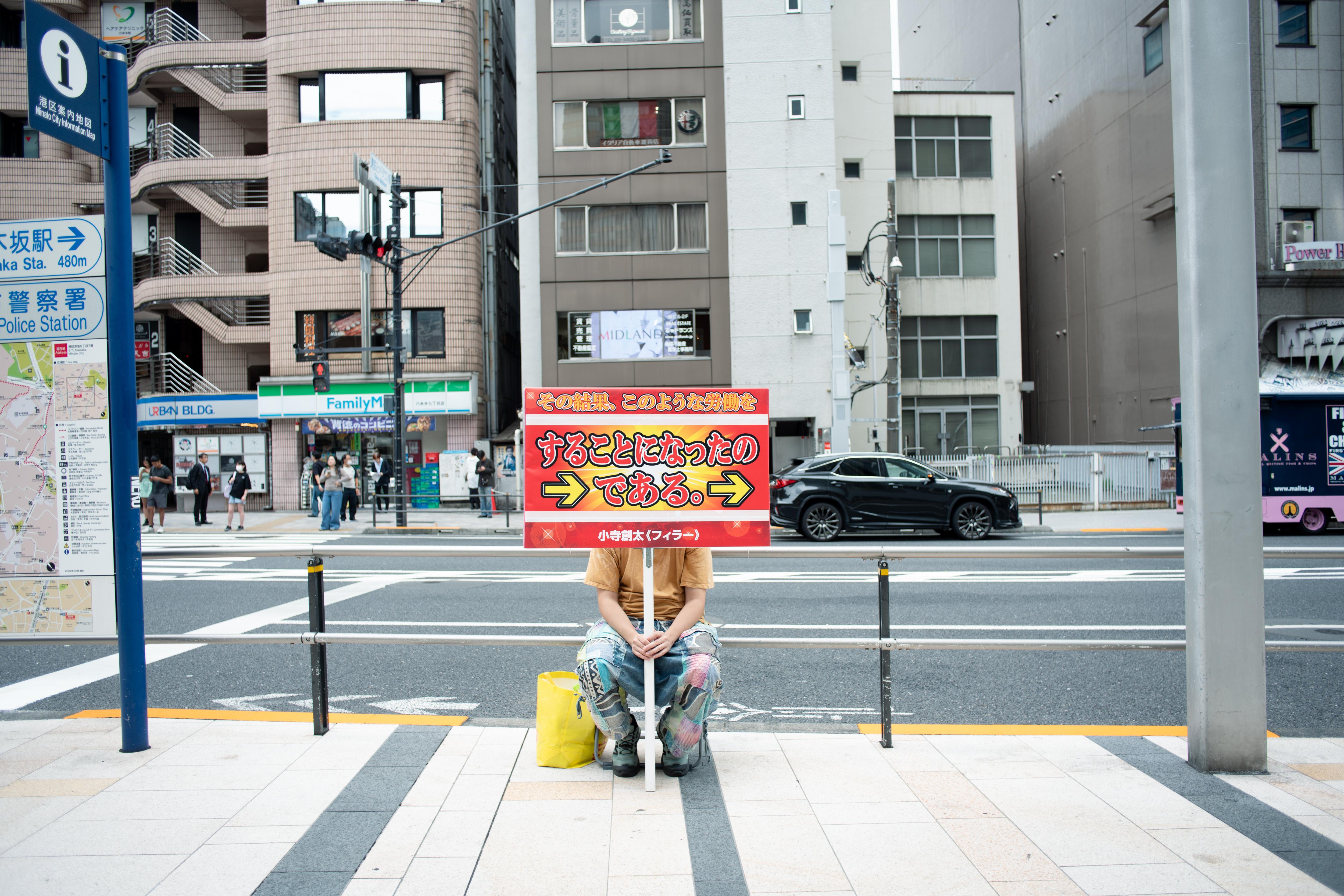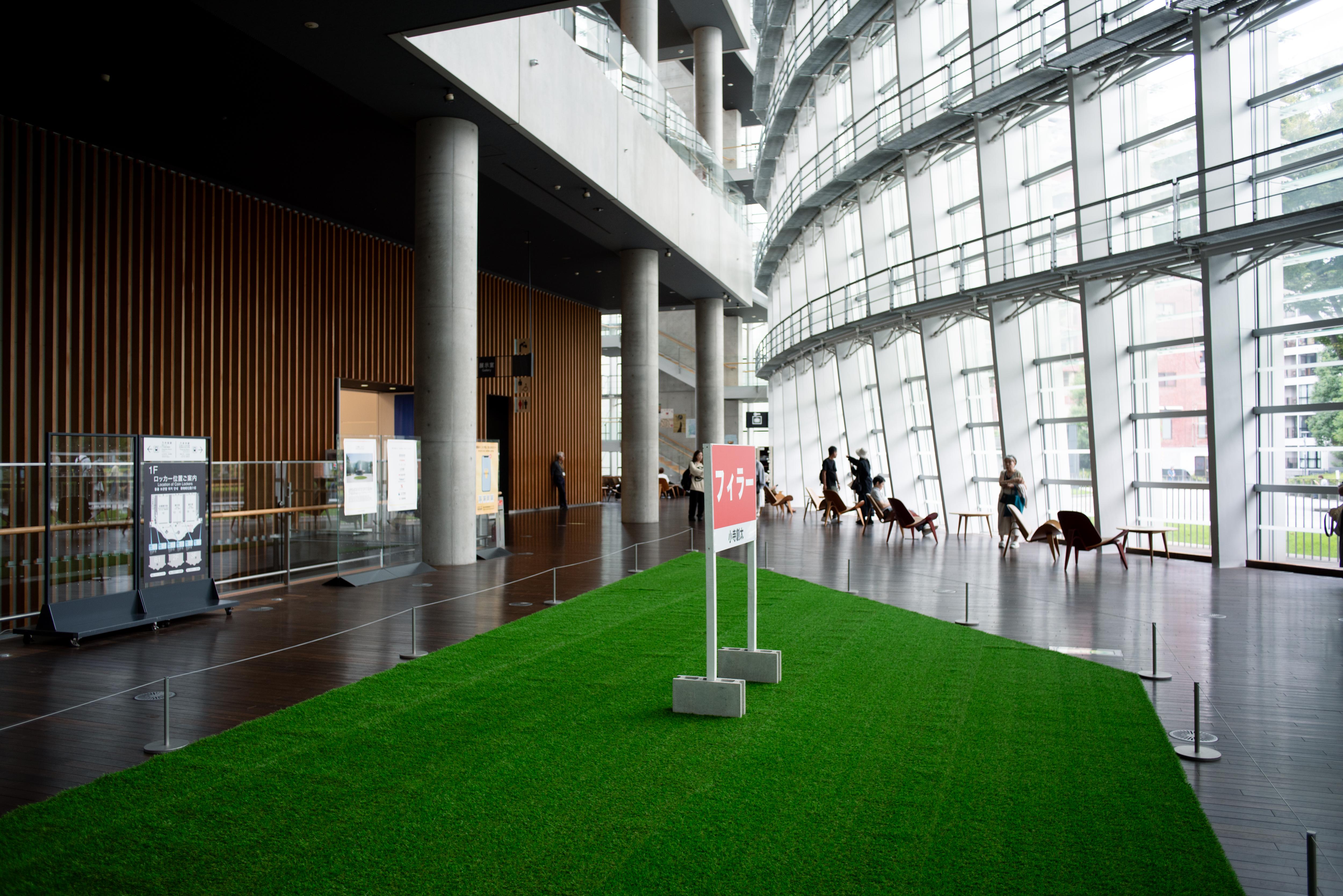 小寺創太は〈いる派〉を名乗り、自らの身体を長時間にわたり展示するパフォーマンス/インスタレーションを制作してきた。しかし本作《フィラー》には、彼自身の身体は作品に含まれず、パフォーマンスは六本木駅から国立新美術館にいたる路上に配置された6人の看板持ちに委任されている。加えて、人工芝ともうひとつの看板が美術館ロビーに設置されている。