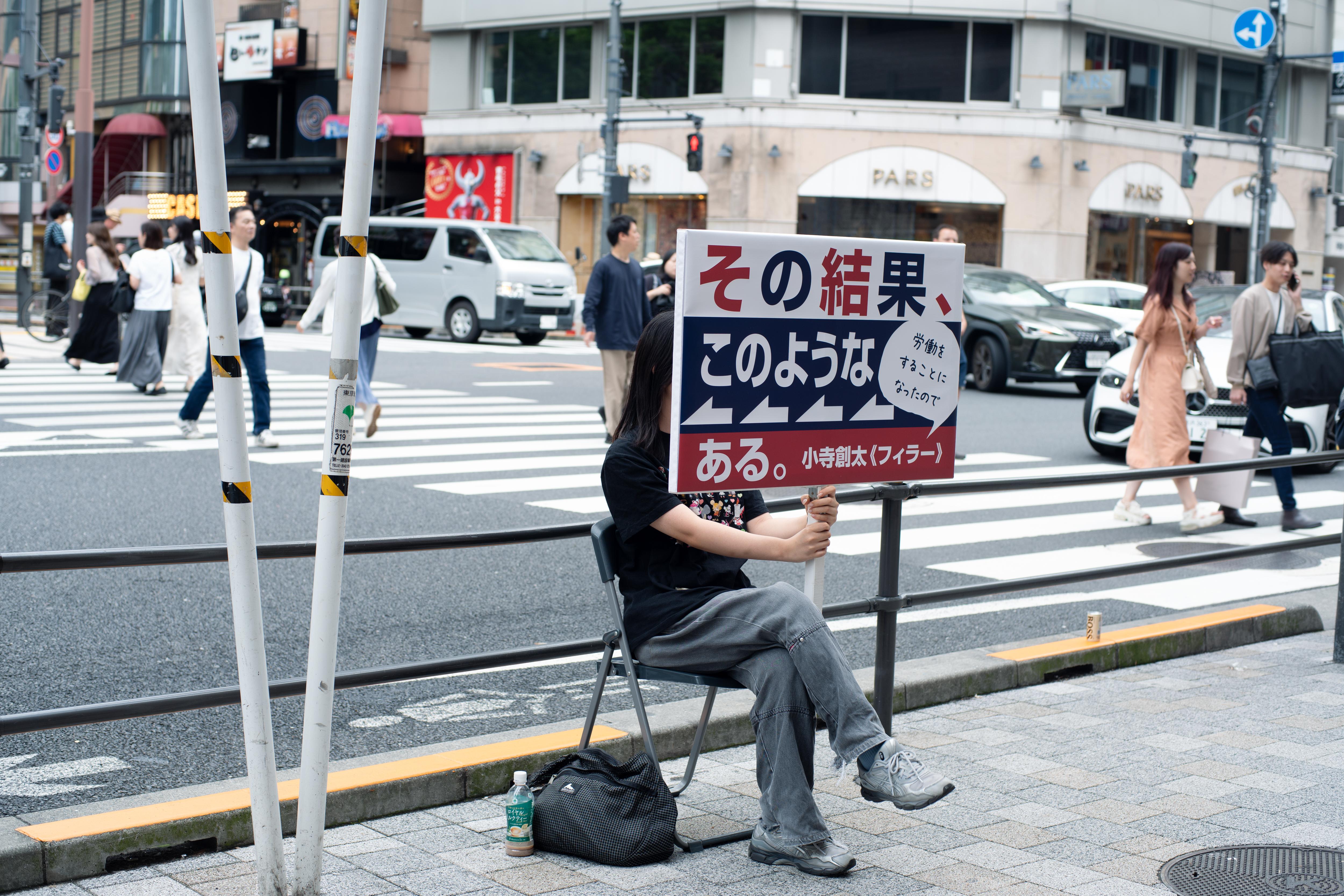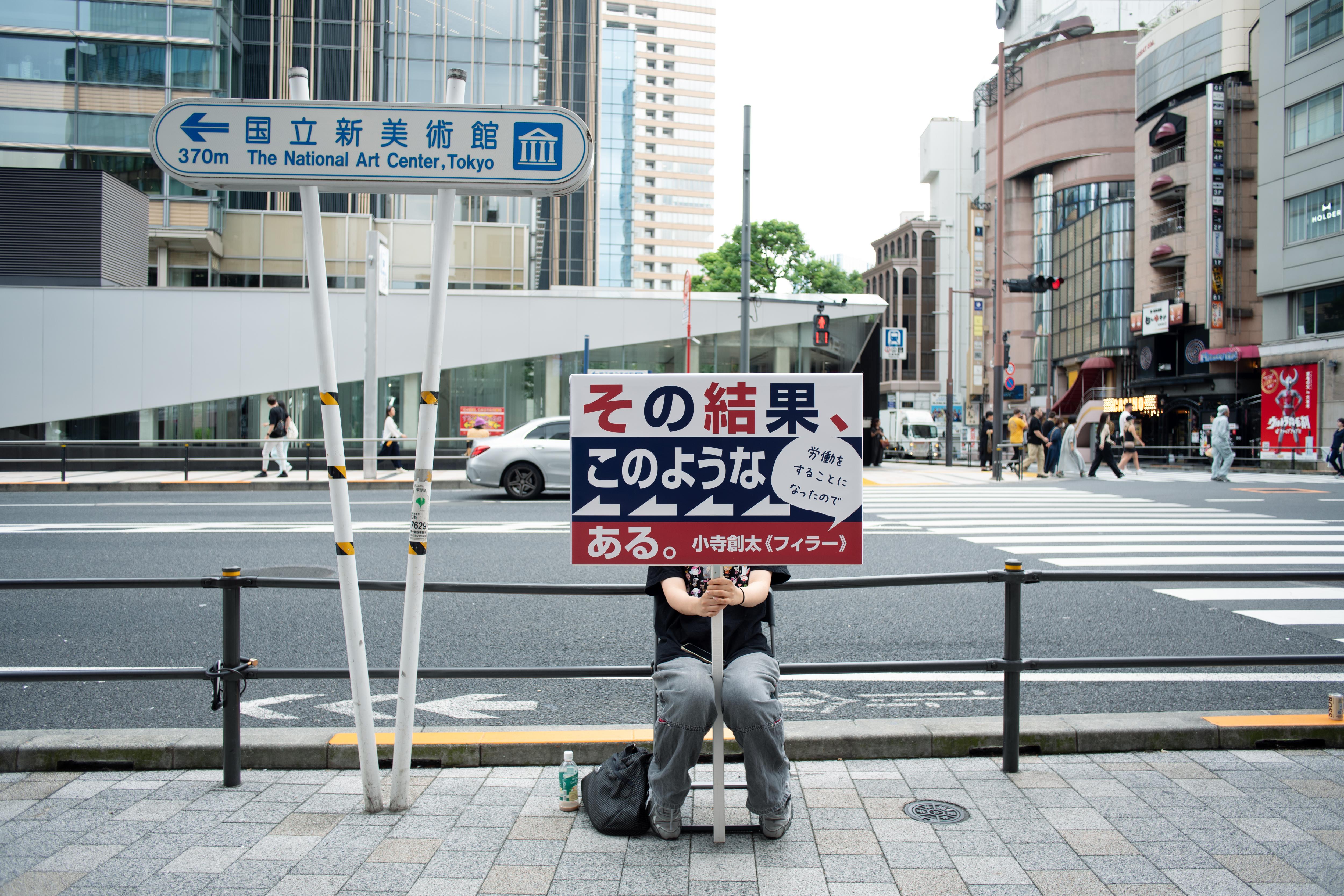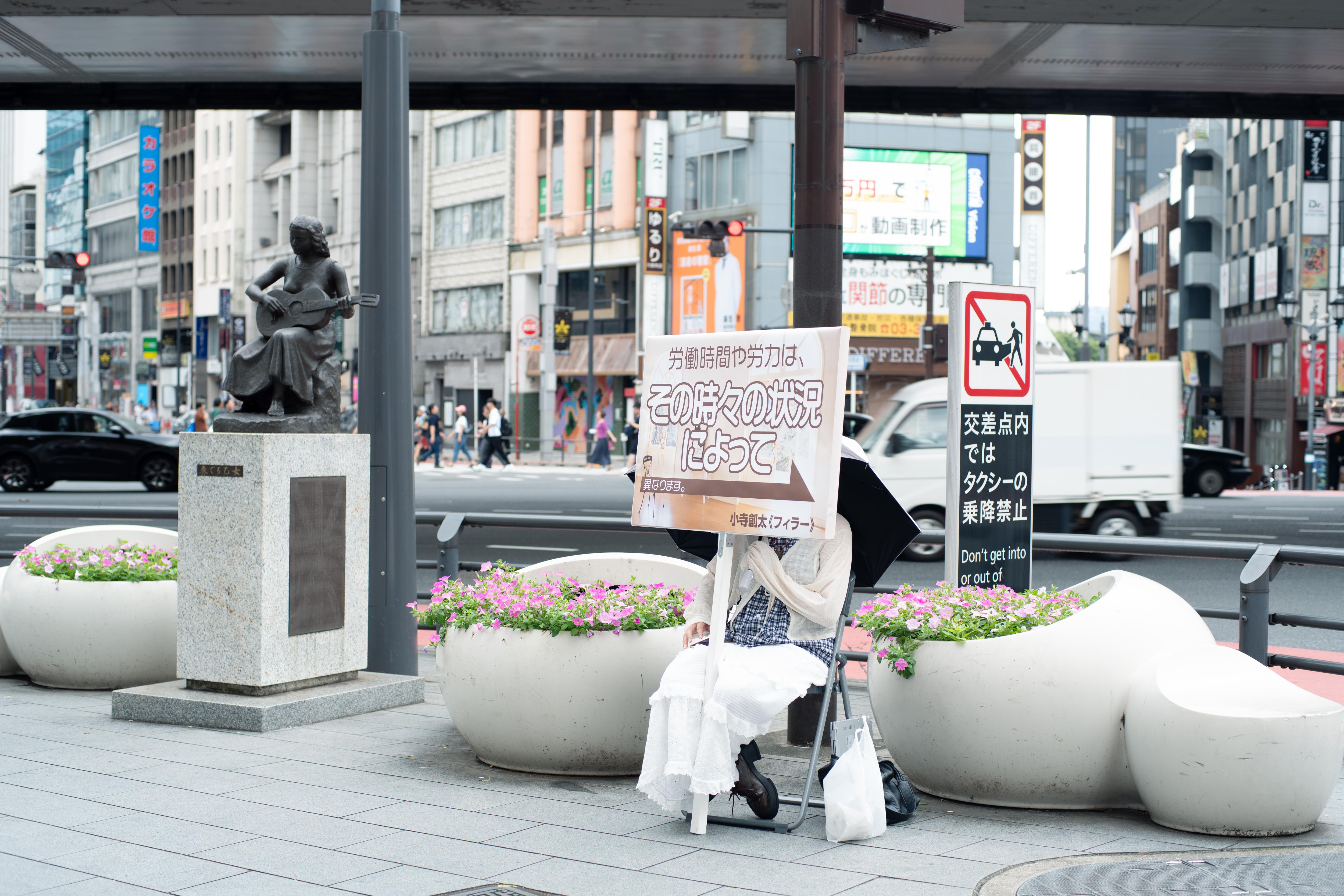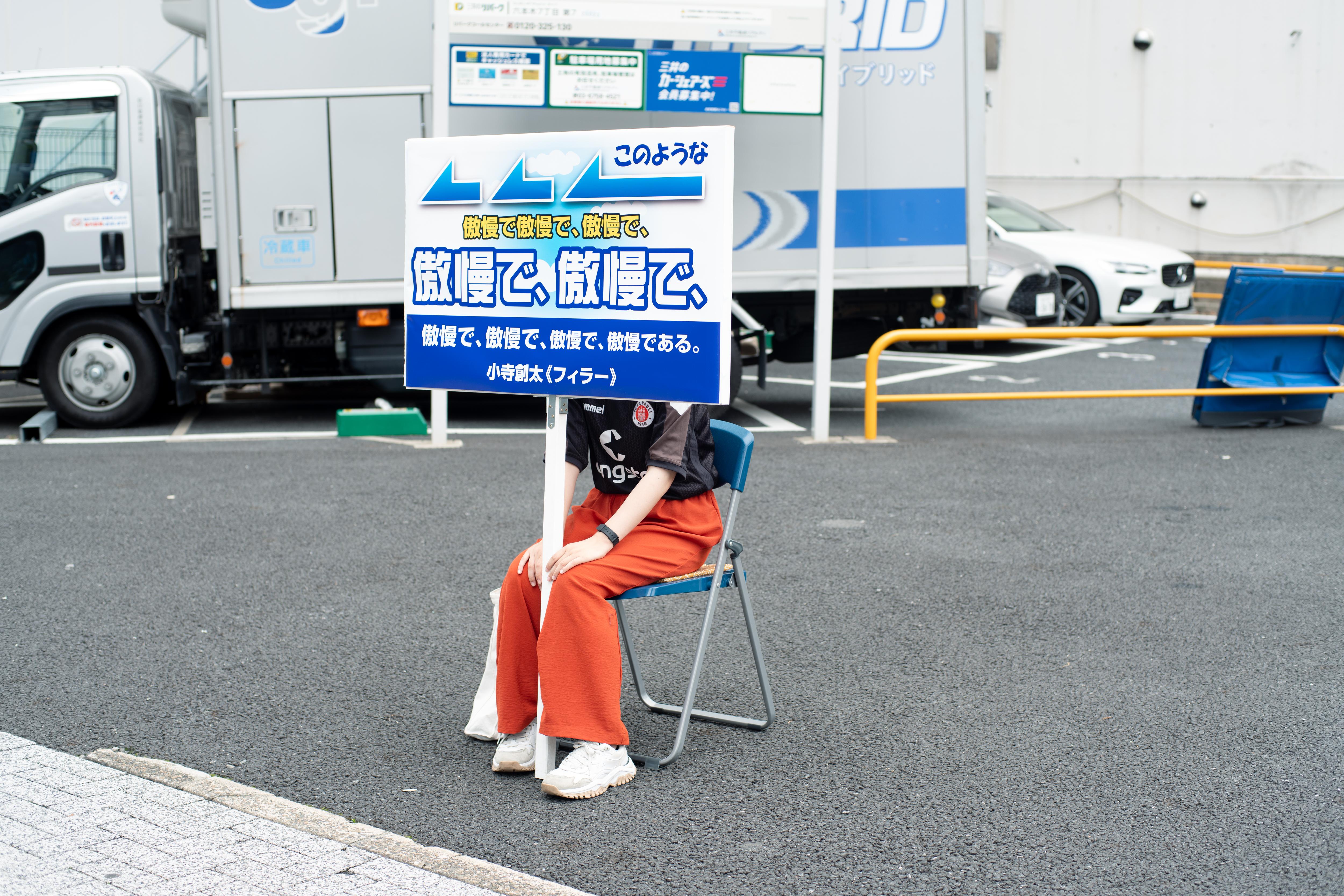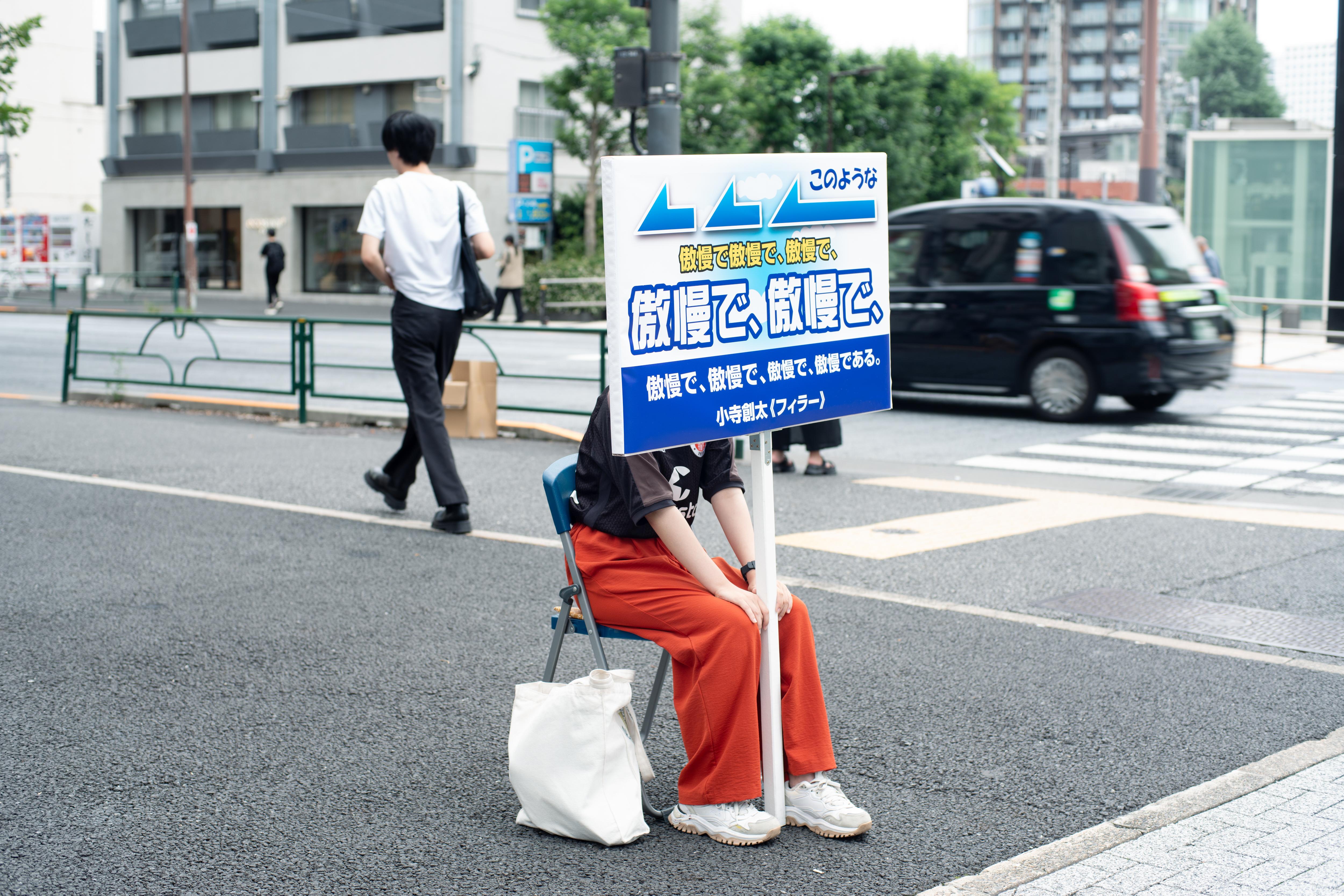 小寺創太は〈いる派〉を名乗り、自らの身体を長時間にわたり展示するパフォーマンス/インスタレーションを制作してきた。しかし本作《フィラー》には、彼自身の身体は作品に含まれず、パフォーマンスは六本木駅から国立新美術館にいたる路上に配置された6人の看板持ちに委任されている。加えて、人工芝ともうひとつの看板が美術館ロビーに設置されている。
