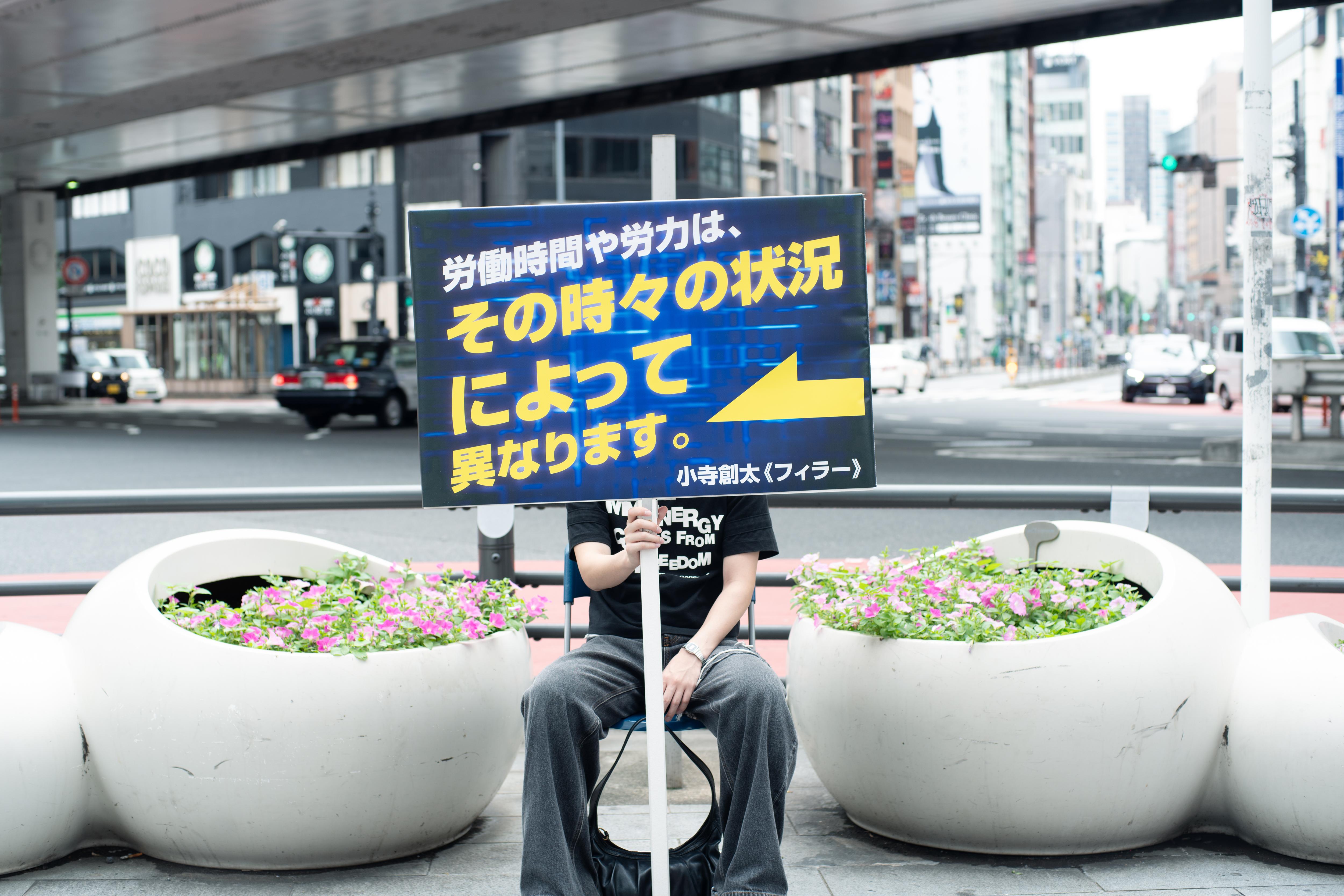 小寺は「フィラー」の概念をフィラーテキスト——出版やデザインの分野において、レイアウトを検討する上でテキスト部分を仮に埋めておくために用いられる無内容な文章——からひきだした。路上の看板に書かれている日本語は、最も普及しているフィラーテキストのひとつ「Lorem ipsum...」のラテン語を、機械翻訳にかけて生成したものである。つまりそもそも無内容な文をさらに解体したテキストであり、何かまとまった主張を読み取ることは難しい。「労働」や「時間」といった単語が、本作のテーマを示唆するのみである。
