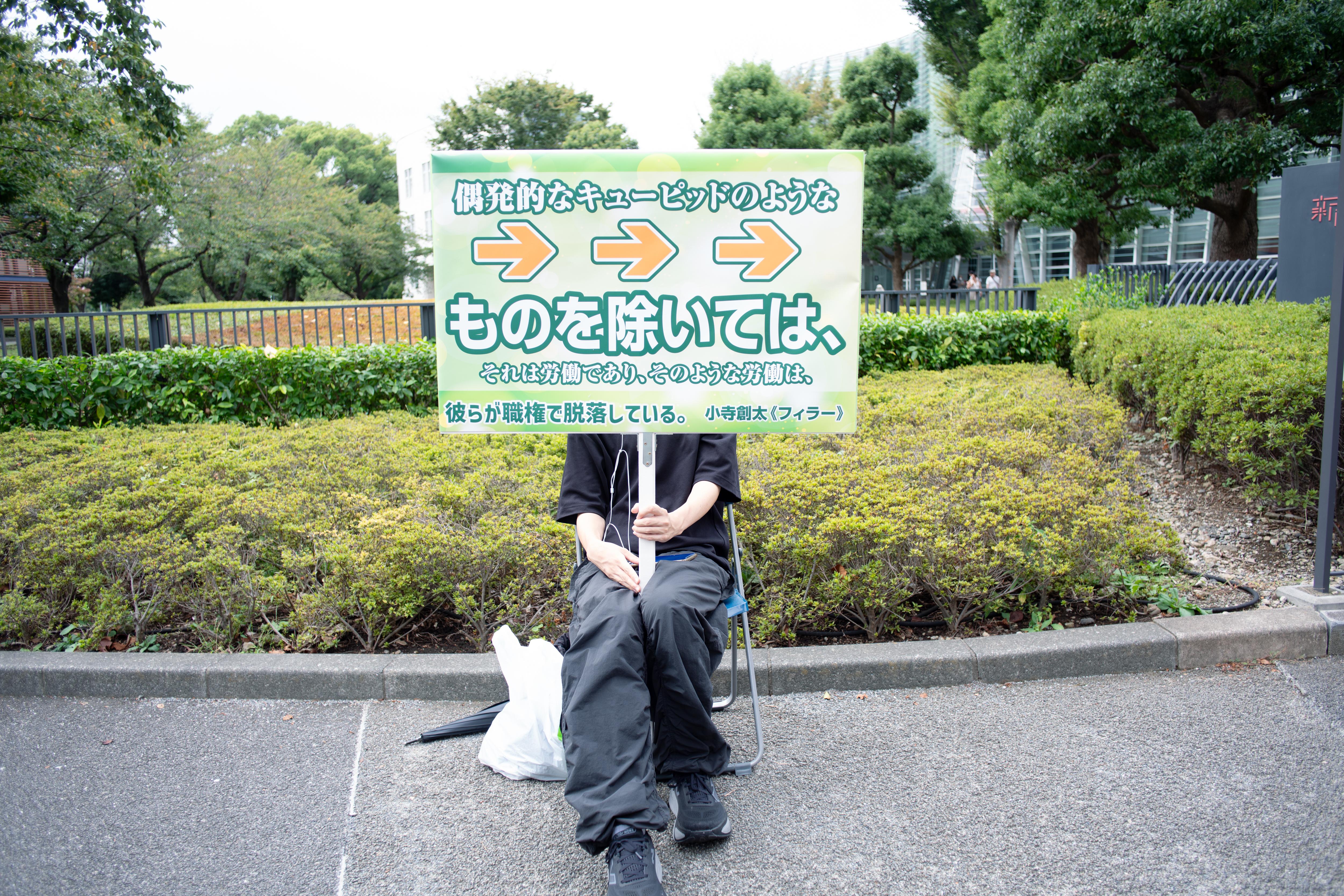 看板持ちは、掲示物に関わるルールの網目を埋めるようにして成立している労働形態である。広告を公道上に掲示するには規制が厳しいが、誰かの所持品であるということにすれば掲示物ではなくなる。そのために、看板の見かけ上の所持者が、まさにフィラー的に雇われるのだ。今回看板を持つのは、小寺の指示により美術館が公募し準委任契約を結んだスタッフである。一般的な看板持ちのアルバイトと同程度の謝金を受け取る彼らは、パフォーマーであり労働者でもある。