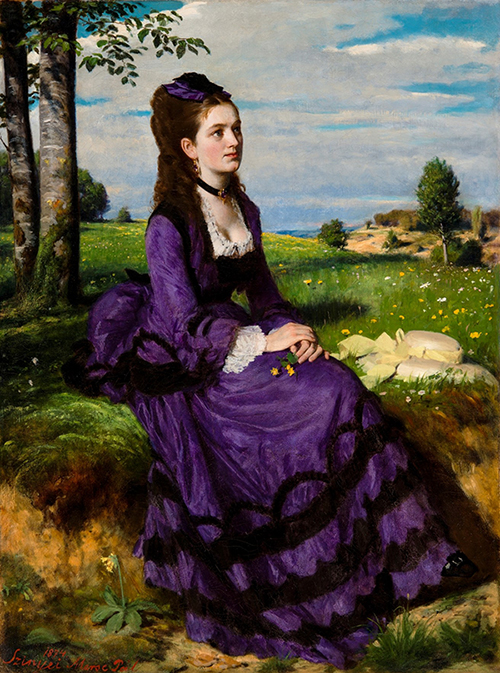 シニェイ・メルシェ・パールは、19世紀後半から20世紀初頭のハンガリー近代絵画の展開に先駆的な役割を果たした画家です。彼はミュンヘンの美術アカデミーで絵画を学び、パリを訪れたことはなかったにもかかわらず、印象派と関心を同じくする絵画表現を独自に追求しました。その好例が、初期の代表作である《紫のドレスの婦人》です。結婚したばかりの妻ジョーフィアをモデルとして描かれたこの作品は、今日ハンガリーで最も重要かつ魅力的な名画として、広く愛されています。しかし、制作当時は、草木の黄緑色とドレスの紫色の強い対比が不評を招き、その表現の斬新さはほとんど理解されませんでした。