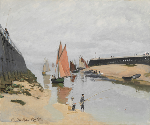《トゥルーヴィルの防波堤、干潮》は、印象派の描き方を模索し始めた頃のモネの様式をよく伝える重要な作品です。1870年6月にカミーユ・ドンシューと結婚したモネは、ハネムーンで訪れたノルマンディーの海岸の街トゥルーヴィルで夏の数か月を過ごし、浜辺の風景を数多く描きました。本作に描かれているのは、海に流れこむトゥーク川の河口の情景です。防波堤がそびえる岸辺で干潮を利用して釣りをする人々や、いくつかのヨットが見てとれます。モネは、雲に覆われた空と灰色の海面の境界をぼかし、ほぼ一体化して描くことによって、曇天の大気のどんよりした印象を見事に表現しました。また、明るいピンク色を一艘のヨットの帆だけに効果的に用い、画面に精彩を与えています。