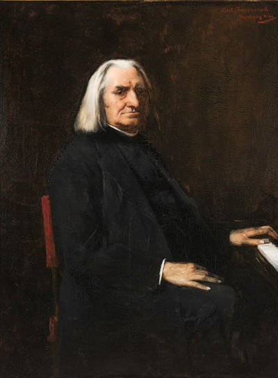 ハンガリー近代絵画の巨匠ムンカーチは、1872年からパリで活躍し、大きな成功を収めました。当初は冷徹なレアリスムの風俗画を描いていましたが、1874年に貴族階級の女性と結婚してからは華やかな社交生活を送り、富裕なブルジョワ婦人の生活情景や肖像画も描くようになります。ムンカーチ夫妻は政治家や芸術家を自邸に招き、社交を楽しむのを常としました。彼らの客人には、ハンガリー出身の高名な作曲家でピアニストのフランツ・リスト(ハンガリー語ではリスト・フェレンツ)も含まれていました。リストは1886年3月にパリに滞在した際、ムンカーチ邸で開かれた歓迎の祝宴でピアノを演奏しています。本作品はその頃に描かれたもので、老練な音楽家の威厳あふれる表情と佇まいが見事にとらえられています。この4カ月後、リストは74歳でその生涯を閉じました。