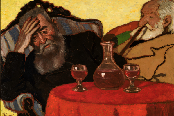 「ハンガリーのナビ」と称されるリップル=ローナイ・ヨージェフは、ミュンヘンで絵画を学んだのち、1887年から10年以上にわたってパリに暮らし、1901年から主に故国で活動しました。パリ時代の初期にはアール・ヌーヴォー様式に手を染めましたが、次第にナビ派の芸術家たちと活動を共にするようになり、平面的・装飾的なスタイルを身に付けました。帰国後、1902年から1907年までハンガリー西部の故郷の町カポシュヴァールを拠点とした時期には、主に室内の情景を主題とし、強烈な色彩表現を特徴とする絵画を描いています。自身の父と伯父がワイングラスの載ったテーブルを囲む様子を描いた本作は、カポシュヴァール時代の最後の年に描かれました。くっきりと太い線で輪郭が描出されたモティーフは、それぞれ異なる色で平坦に塗り分けられ、激しいコントラストをなしています。