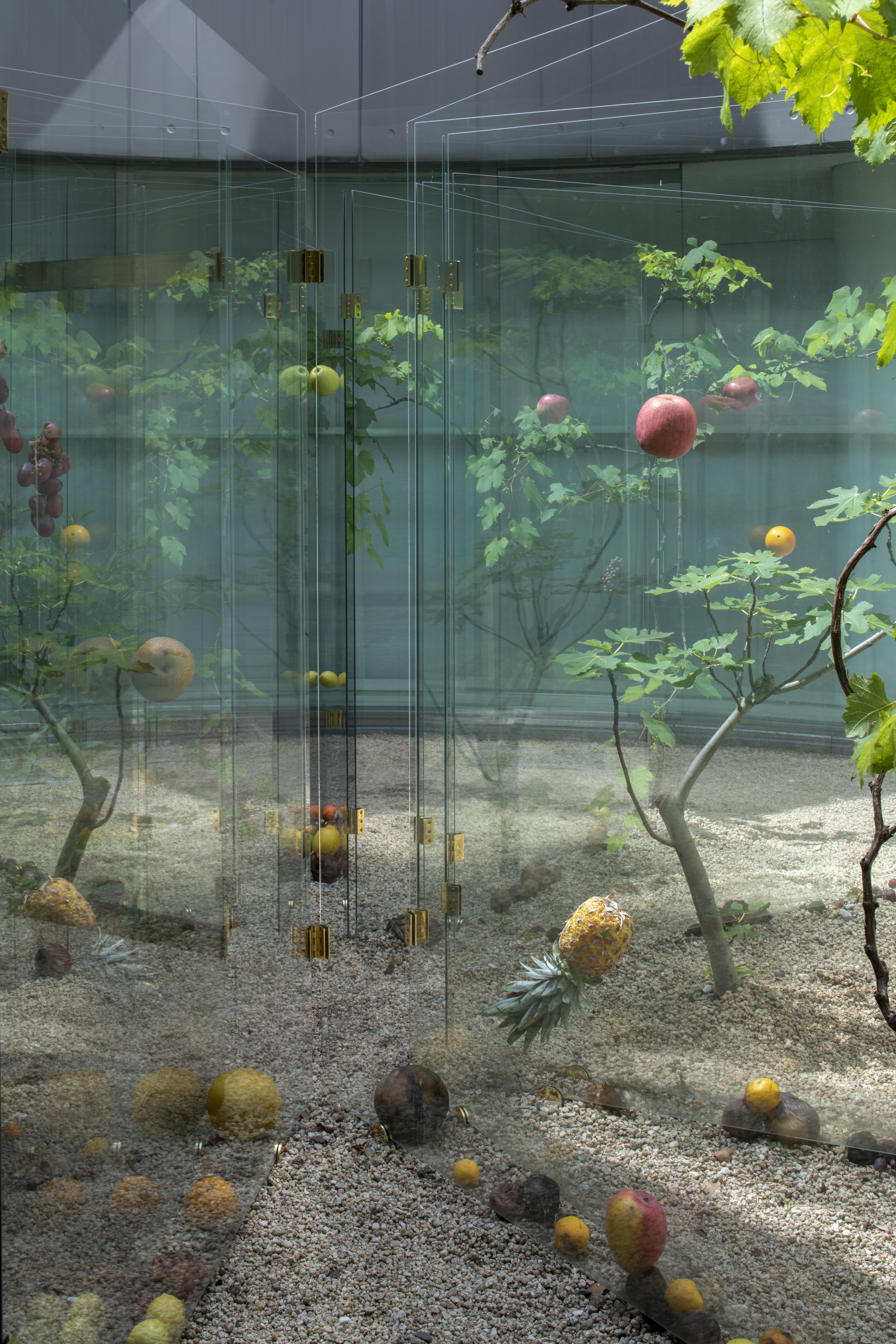インスタレ―ション《FORBIDDEN FRUIT》は、複数の強化ガラスと生の果実と果樹で構成されています。作品の中央にある等身大の空間から投企された様々な果実は、強化ガラスの間に挟まり、空中で静止しています。瑞々しい果実は時間の経過とともに落下し、地面で朽ち果てていきます。作品タイトルの「禁断の果実」は、旧約聖書『創世記』の挿話「失楽園」に登場する「知恵の樹」を示唆しています。本作には、神話にまつわる林檎、葡萄、無花果、柘榴などの様々な果実の他にも、砲弾やケシの実のようなブロンズの異物も使用されています。一方、放射状に配置された強化ガラスの構造体は、ある種の透明なパノプティコン(展望監視システム)の形状を成しています。構造体の中心の虚空は、神話における楽園の中に人間的な争いが潜んでいることを暗示しています。本作は、建築と庭園の要素を統合しつつ、生命と時間という根源的なテーマを風景として結晶化させています。
